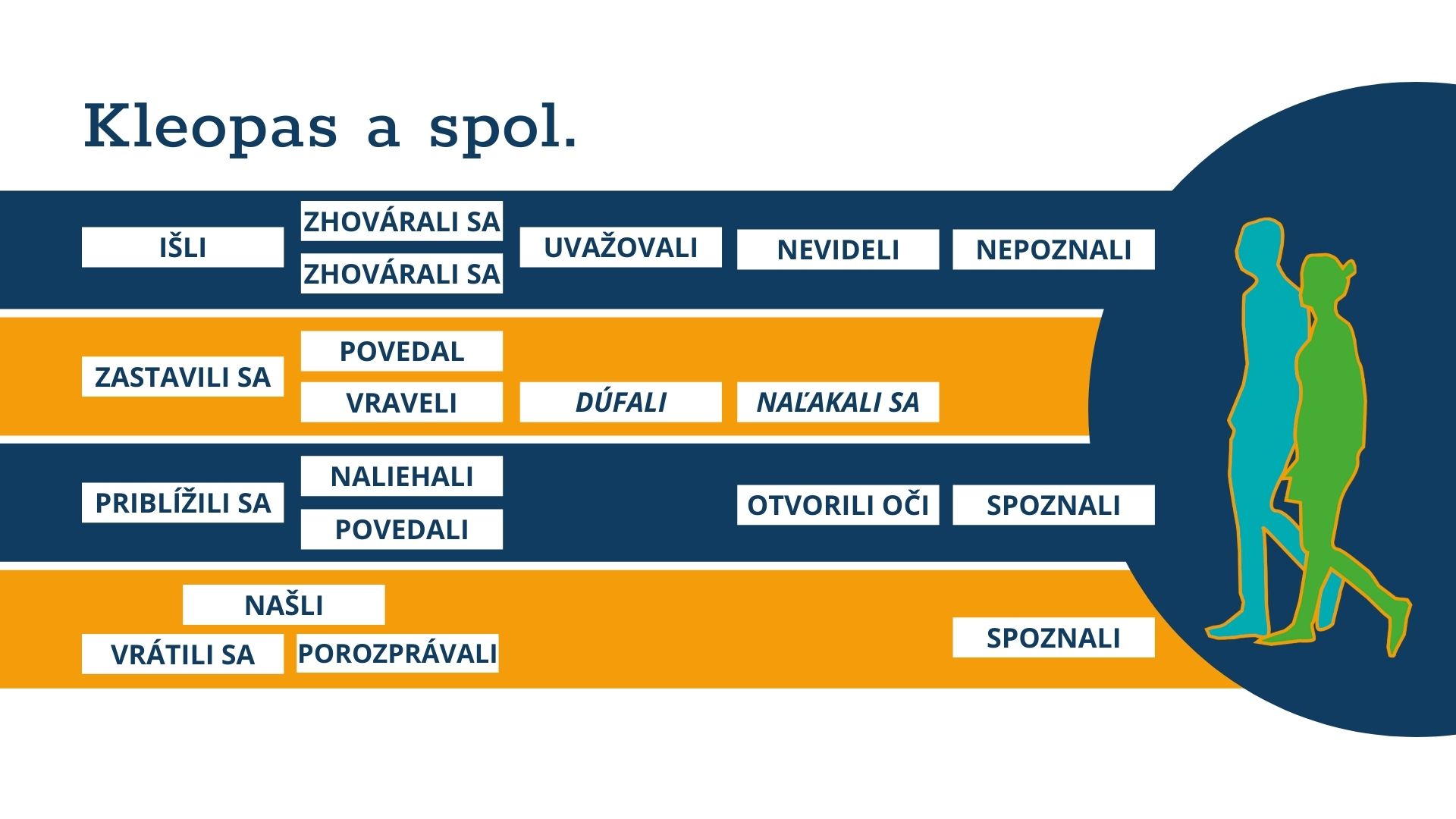 - V príbehu sa spomínajú dvaja z Ježišových učeníkov, jeden z nich sa volá Kleopas, meno druhého Lukáš neuvádza, niekedy ich označujeme aj termínom Emauzskí učeníci. V prezentácii je zámerne použitý obrázok páru, muža a ženy. Je to odkaz na jednu starobylú tradíciu, podľa ktorej mohla byť druhou z dvojice Kleopasova manželka, tiež jedna z Ježišových učeníkov. Zároveň nám to potom poslúži ako premostenie k otázke „Ako sú vypočutí laici, najmä ženy a mladí ľudia?“